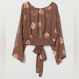 Short blouse in airy, crinkled chiffon made partly from recycled polyester with a wide neckline and pleats at the top. Low dropped shoulders, wide, 3/4-length sleeves and an open back with decorative gathers and ties. Unlined.