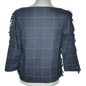 H&M Pullover Top Shirt Women's Size 4 Blue Black Check 3/4 Sleeve Fringe Work, boat neck