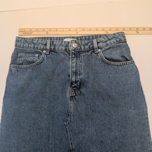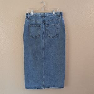 H&M Classic blue denim maxi skirt. Features a straight cut with slit in front. Pockets on front and back. Perfect for casual wear.