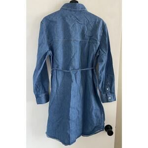 Stylish denim midi dress. Button-down front. Tie waist detail. Long sleeves. Perfect for casual outings.