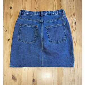 Stylish blue denim mini skirt. Features classic five-pocket design. Frayed hem for a trendy look.