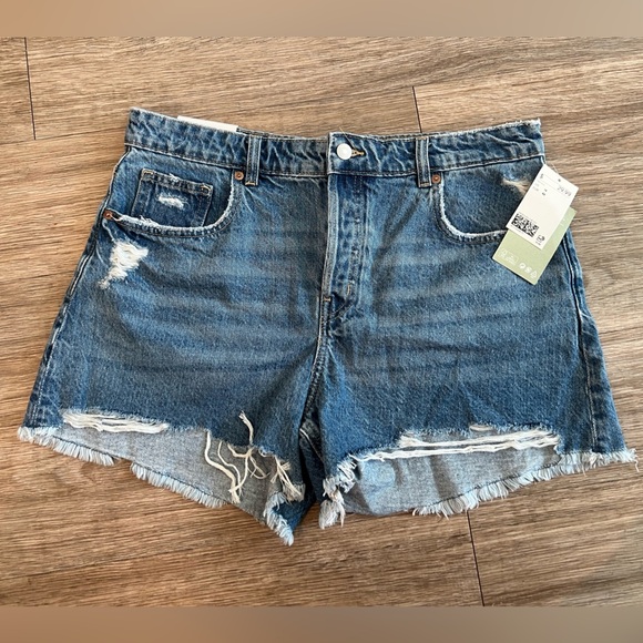 Trendy blue jean shorts. Distressed details. Frayed edges. Classic pockets.