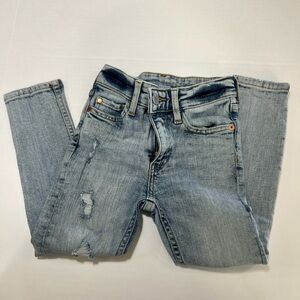 These H&M jeans showcase a light blue wash with a straight-leg design, providing a comfortable fit. The distressed detailing on the front enhances their casual, worn-in appeal, making them ideal for everyday wear.