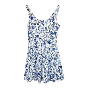 H&M Blue Floral Sleeveless Skater Jersey Dress Women's Sz 8 Low Back ResortWear