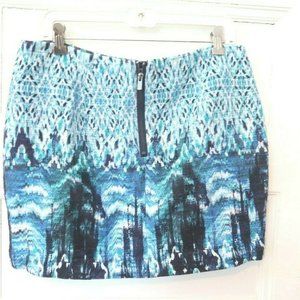 H & M cotton linen textured blue green abstract watercolor print mini skirt. Lined