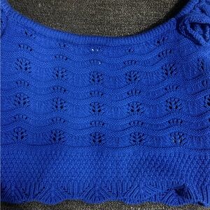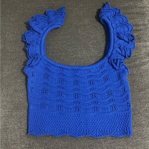 A vibrant blue knit tank with feminine ruffle straps. Features a textured openwork pattern for breathable comfort. Cropped silhouette perfect for layering or warm-weather looks. Soft stretch knit for an easy, flattering fit.