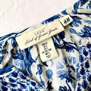 This H&M Top Blouse has lace detailing, button up front, blue Mediterranean / italian floral print, lasting in the hemline and 3/4 length sleeve cuffs. This has an open shoulder boat neckline.