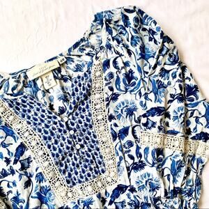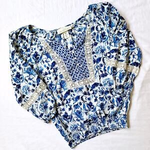This H&M Top Blouse has lace detailing, button up front, blue Mediterranean / italian floral print, lasting in the hemline and 3/4 length sleeve cuffs. This has an open shoulder boat neckline.