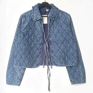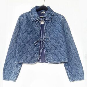 Stylish blue quilted jacket. Features a ruffled collar and tie closure. Perfect for layering.