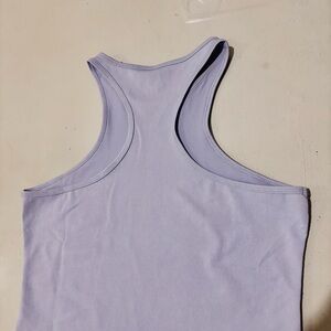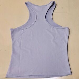 A soft blue ribbed racerback tank with a sleek athletic cut and modern stretch fit.