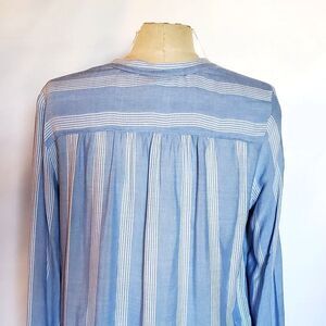 Great summer shirt. Classic style with pretty, lightweight textured fabric, gathered at the shoulder for a flattering fit... Says Size 4, but it is oversized so it seems bigger.... 19" at bust, 26" from shoulder to shortest hem... Indonesian fabric