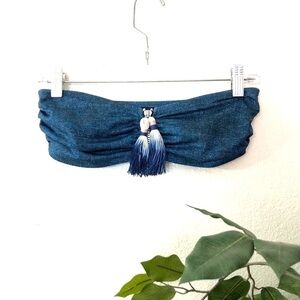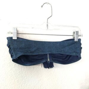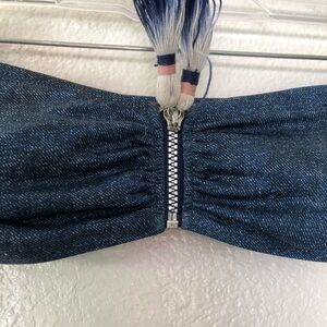 An adorable, stretchy bandeau top. Easy to get on and off with the silver front zipper that’s accented with ombré white to blue strings! Wear when you go to a pool bar (as long as you don’t plan on swimming lol) or just with high water shorts for a hot summer outfit!