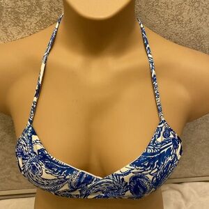 Colors are a white background with a paisley print in various shades of blue. It’s designed to look like a wrap top which shows best from the backside. The faux wrap creates little cut outs along the sides. It has a nice wide lower strap and a skinnier spaghetti halter strap. Includes padded inserts, however, they are crinkled from storage. Measurements are included. This is listed as a size 8, which is a women’s medium. Brand new without tags.💙 sold as pictured. Color may vary, depending upon your screen settings. May wrinkle during shipping.🤍Bin 52–97