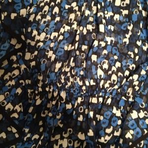 Blue white and black dotted top. Sleeves flow over the shoulders. Super cute! Banded waistband in the middle. lightweight and comfortable.