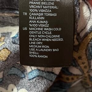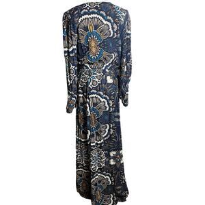 Description: Stunning H&M boho-inspired maxi dress featuring a bold allover floral print in shades of navy, white, teal, and mustard. Designed with a deep V neckline and lace-up bodice for a sexy, eye-catching detail. Long sleeves with button cuffs, elastic waist for comfort, and two dramatic front slits for movement and style. Lightweight rayon fabric with great drape. Perfect for vacation or resort wear, with a versatile silhouette that can easily go from beach to night out.
