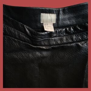 Flirty and fierce black mini skirt made from lined, textured bonded leather (thin leather bonded to synthetic material) with fitted a waistband and flared bottom with an unfinished hem. Side closure with hooks and zipper. Great condition, measurements in photos.
