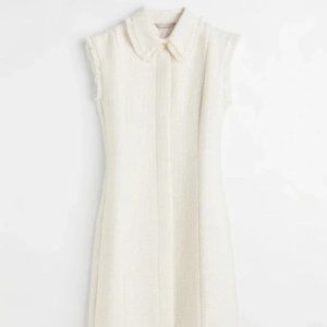 Fitted, calf-length dress in woven, textured bouclé with wool content. Collar, concealed buttons at front, and cap sleeves. Raw fringe trim at collar, cuffs, and hem. Lined.