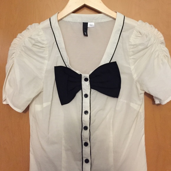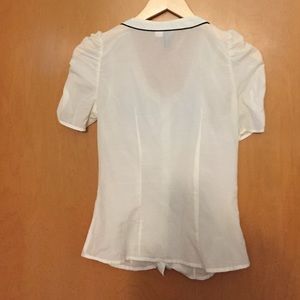 Rusched sleeve detail. Contrast piping at neckline & buttons. Fun work shirt!