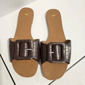 Add a sophisticated touch to your footwear collection with these H&M brown croc-embossed slide sandals. Featuring an elegant oversized buckle detail and a comfortable flat sole, these sandals are ideal for casual wear or pairing with your favorite summer outfits. Versatile and stylish, they are perfect for any occasion.