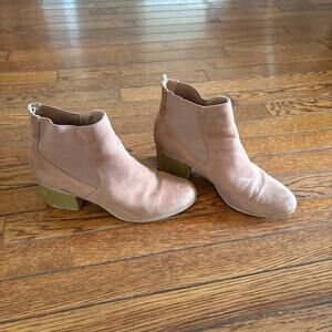 Suede camel ankle boots, size 8.5. Worn a few times with some usual wear and faint stains (shown in pics). Shoes have a short block heel and very comfortable to walk in.