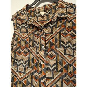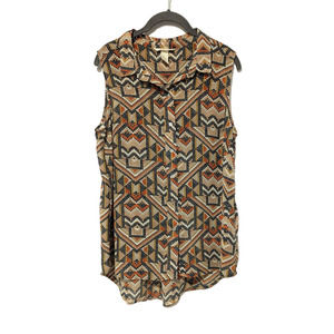 H&M Brown Tribal Boho Print Front Button Sleeveless Blouse, Size 10