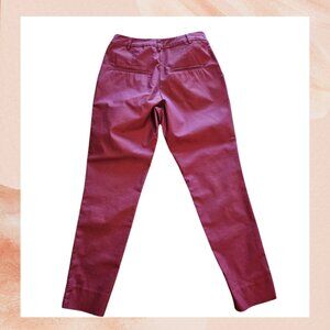 Pre-loved. Burgundy, ankle length slacks in woven stretch fabric. Regular waist, concealed elasticized waistband, and zip fly with concealed hook and eye fastener. Side pockets, mock back pockets, and tapered legs.