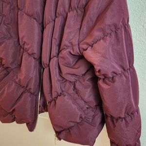 Divided by H&M satin puffer quilted jacket. Full zip. Lovely burgundy/maroon color. Very stylish and perfect for rain, snow and cold weather. No flaws.