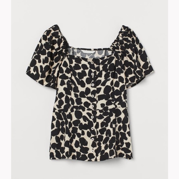 Blouse in a slub-weave viscose blend with linen content. Square neckline, buttons at front, and gently shaped seams front and back. Elastic over shoulders and short puff sleeves. Seam at the waist.