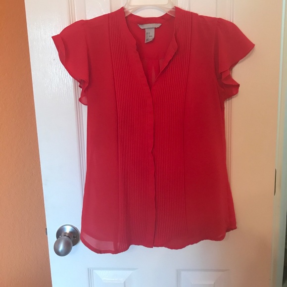 Red H&M button up blouse with frills on front and some what ruffled sleeves. This top can be great for work and super cute tucked into a skirt or slacks. In a size 4, so it fits like a small, and has a sheer material that may need a camisole/tank top underneath. In great condition.