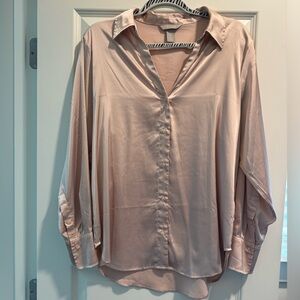 Three long sleeve button ups from H&M. The material is a silky/satin type material with a little sheen. Great to wear with dress pants to the office. I think they fit a little oversized//loose, but perfect tucked in! Colors are light pink, light taupe, and a light turquoise.