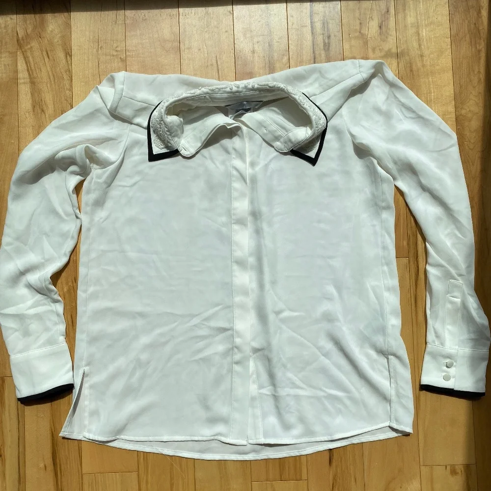 This blouse is amazing. It has intricate bead work on the collar and delicate black trim. Size 4. Excellent used condition no signs of wear/tear/stains/snags.