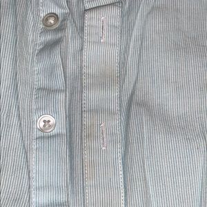 White with thin blue stripes. Slight stain on front. In picture. Looks like it will come out. Chinese collar