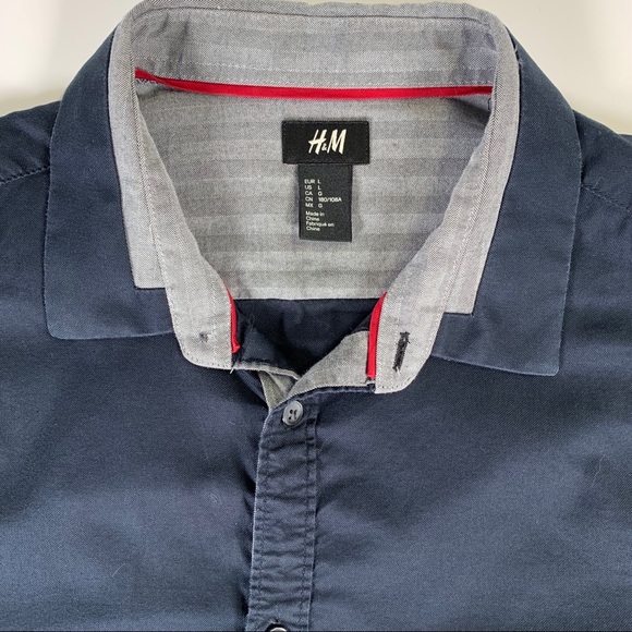 Navy blue outer: baby blue “denim” inner. Slim fit for a Large. Excellent Pre-Owned Condition.