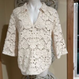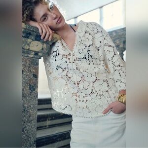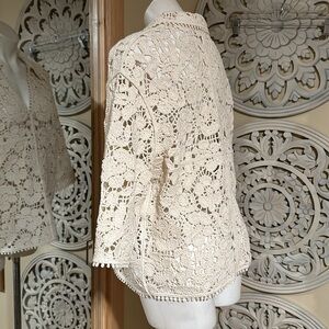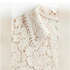 Elegant H&M CROCHET-LOOK TOP BLOUSE SHIRT TUNIC BOHO LACE CREAM cream lace sweater. Features intricate floral design. Perfect for layering.