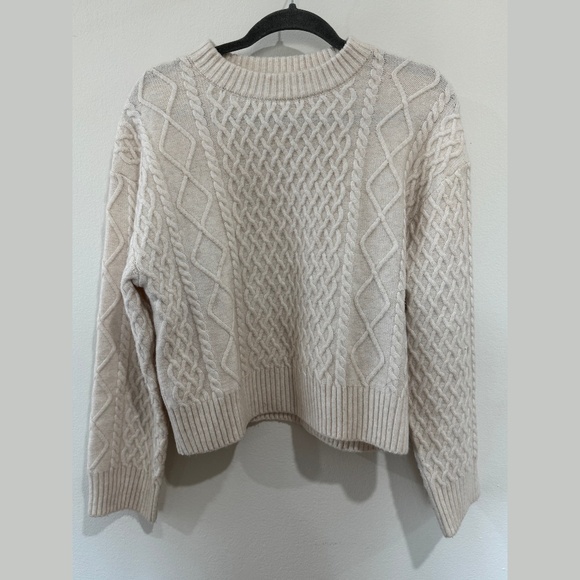Jumper in a soft cable knit containing some wool. Loose fit with a round neckline, dropped shoulders and long sleeves. Ribbing around the neckline, cuffs and hem.