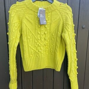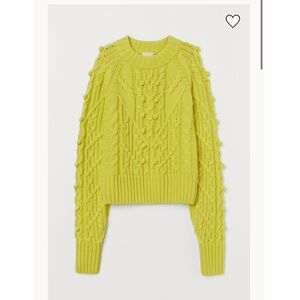 Short, cable-knit sweater in a soft wool blend. Decorative pompoms at front, long raglan sleeves, and wide ribbing at neckline, cuffs, and hem.