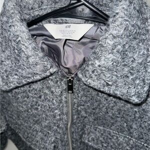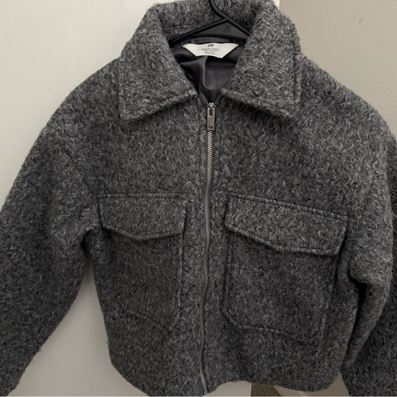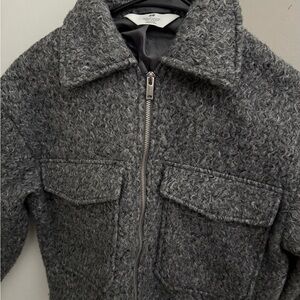 Charcoal jacket with textured fabric. Features a zip closure and classic collar.