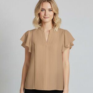 A chic and versatile blouse in lightweight chiffon with delicate pleating. Neutral tan shade makes it a perfect layering piece for workwear, dinner dates, or everyday style. Short sleeves and flowy silhouette add comfort and sophistication.
