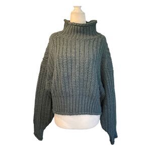 H&M Chunky Knit Sweater Green Ribbed Wool Mock Neck Long Sleeve Cropped M