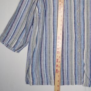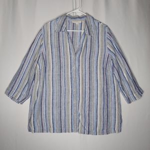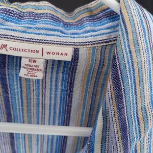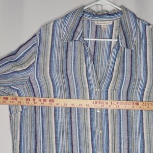 HM Collection Linen Button Top Women 16W Blue Metallic Stripe Collar 3/4 Sleeve