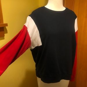 Navy blue sweatshirt pullover with white and red colorblock. In good condition!