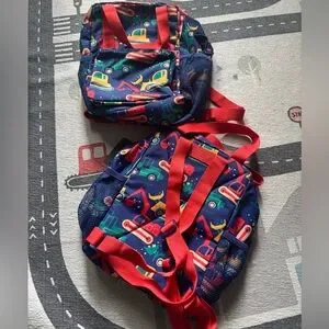 Vibrant backpacks with construction vehicle print. Features red straps and a playful design. Small ( best for PreK, KG . Set of 2. Like new condition.