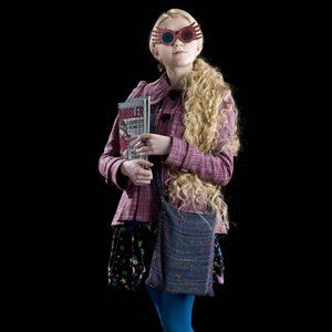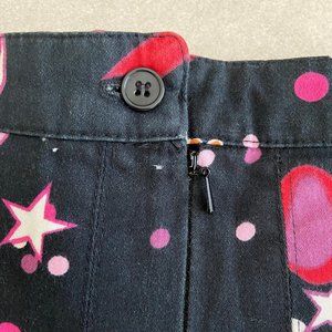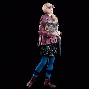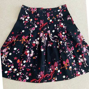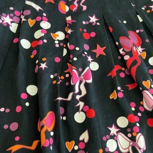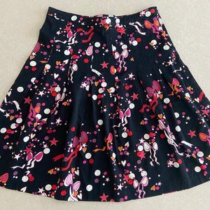 H&M Confetti Party Skirt as seen on Luna Lovegood in Harry Potter and the Half-Blood Prince (2009). Luna's has blue, yellow, pink and green confetti with unicorns. This one has red, orange, pink and purple confetti with bows. Same style and brand, alternate color. An EU38 is roughly a US6. I think Luna's was shortened somewhat.