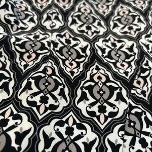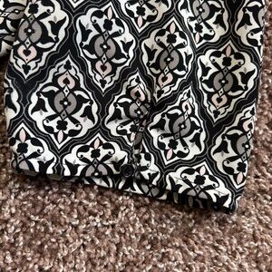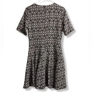 This dress showcases a fit-and-flare silhouette with a crew neck and short sleeves, ideal for casual or work occasions. The black and white geometric pattern offers a timeless appeal, while the fitted bodice and flared skirt enhance its feminine charm. Its mini length adds versatility to your wardrobe.