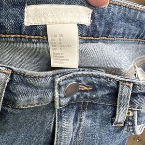 The H&M Conscious Jeans for women in size 8 are a stylish and sustainable choice for everyday wear. Made from a 94% cotton,5% polyester and 1% spandex denim fabric, these skinny jeans feature a patchwork design with a mid-rise and raw hem, adding a trendy and edgy touch to your wardrobe. The zipper closure, button and 5-pocket design make them practical for everyday use, while the light wash and solid pattern give them a versatile look. Machine washable and with a stretch feature, these jeans are a comfortable and fashionable option for the modern woman.