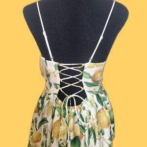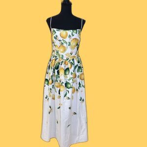 Calf-length dress in woven cotton. Adjustable, extra-narrow shoulder straps and a lined, fitted bodice with narrow ties crossed at back. Gathered seam at front of waist for a draped effect and narrow elastic at back.
