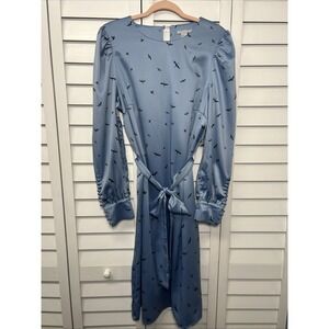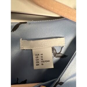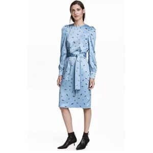 H&M Crane Print Long Sleeve Satin Belted Midi Dress Size 16 Dusty Blue RARE NWT