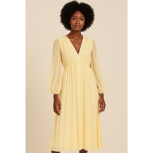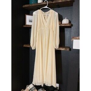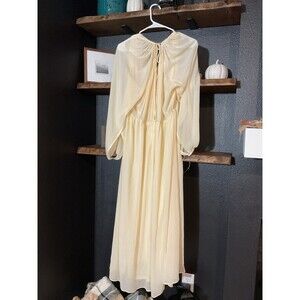 This vintage style women's dress from H&M is a creamy chiffon maxi dress designed in a flowing boho romantic style. The dress features a long length and is perfect for women who love the Bohemian theme. Made from chiffon fabric, this dress is in size Large and is suitable for regular size women. The cream color adds a touch of elegance and nostalgia to the overall look, making it a versatile piece for various occasions.