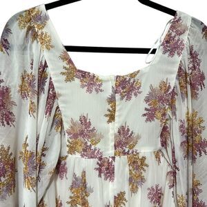 Elegant floral maxi dress. Flowing sleeves and ruffled hem. Perfect for any occasion.