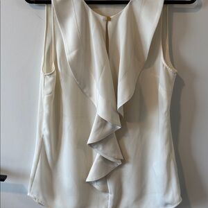 Super versatile, sleeveless blouse that's perfect for under a sweater or blazer for work. Cute button detail on the back, with a ruffle neckline.